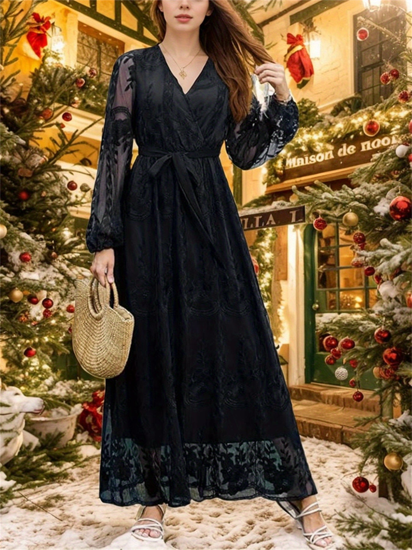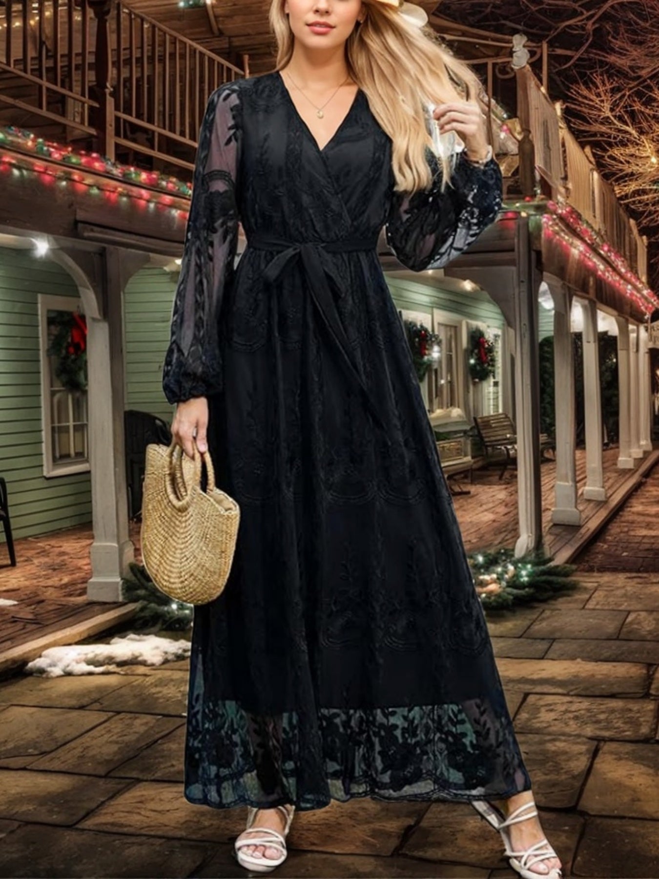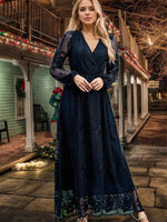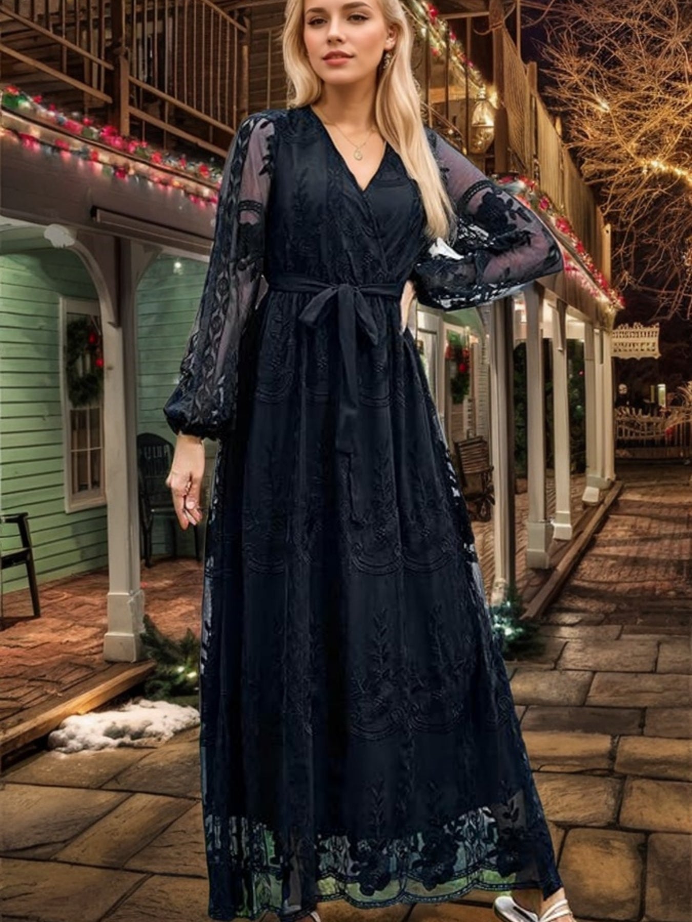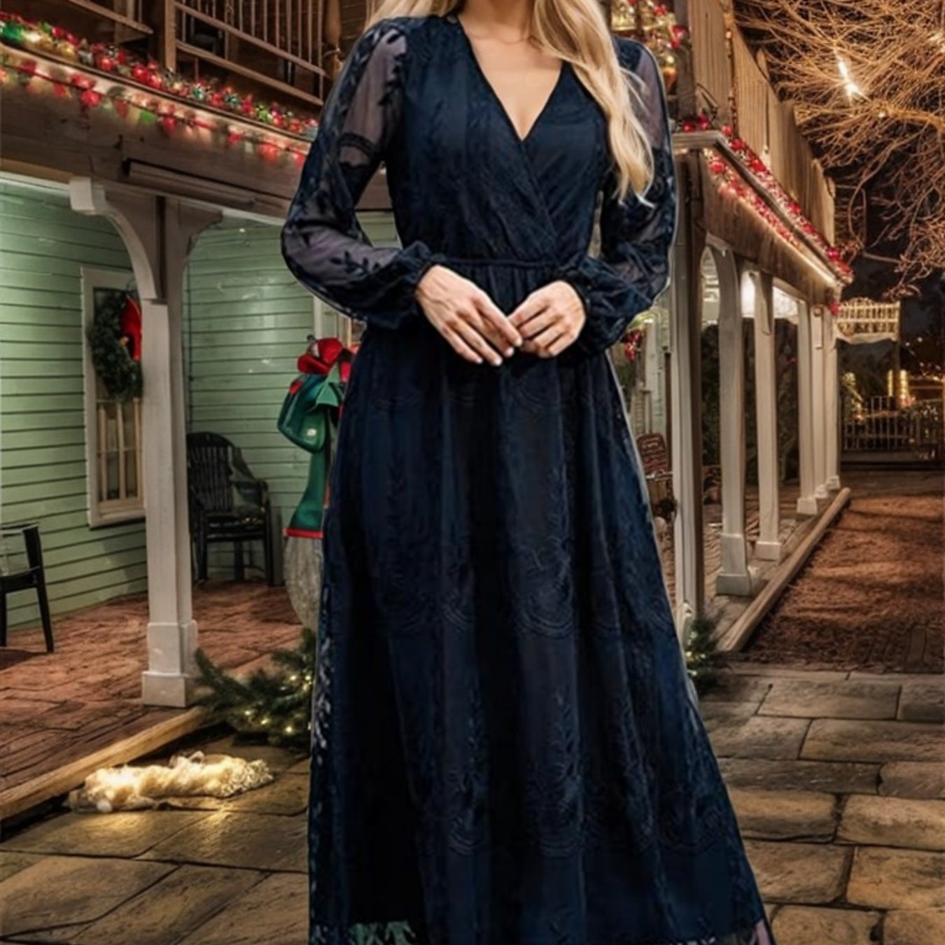Elegant Christmas Lace VNeck Floral Dress Long Sleeve